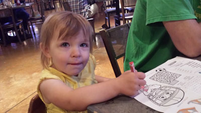 A family dinner the night before we left at Amerisports Bar. Granddaughter, Jillian, is keeping herself occupied! |