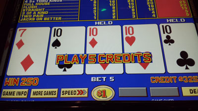 So excited to start our adventure, but FIRST, we wanted to give our wonderful hostess, Carrie, a little giftie. On this LV trip, we were joined by our nieces, Lisa (TX) and Anne (MO), and my brother, Roger and his wife, Jane (AZ). Many pics to follow!!! All of us actually spent some time out of the casino, taking time to visit Red Rock Canyon and Red Rock Casino, thanks to Roger's chauffering skills! Had to get out of the car and watch some crazy rock climbers. Serious stuff. After the Canyon, we took some time to explore the Casino. We had never been there. Quite awesome. I shared a wonderful outdoor lunch with Roger and Jane, while Bob and Lisa caught a snack then hit the machines hard. A little friend we found (behind glass, thank goodness) at the Red Rock Canyon Visitor Center/Gift Shop. Look who I found outside the visitor center!! A wonderful dinner at the new Noodle House at The California! Our very own special room in the back - so we could get crazy and noisy, neither of which we did. Roger draining the brain of Bob Kinnard, Assistant Slot Manager for the Boyd properties downtown. So glad Bob could could join us, if just for a drink. What a generous and nice guy!! Yes . . . we ARE always eating. That is always the most social part of our trips. Enjoying Breakfast at The Cal with Roger, Jane and Lisa. Gearing up for our road trip to Mt. Charleston. One of the ski lodges on Mt. Charleston. Enjoying our time at a real family-style ski lodge. Roger and Annie Fooling around in Roger and Jane's room, while taking our annual California denim shirt pictures. Outside the ski lodge after lunch. Annie thinking, "Where in the heck is my drink!!" Other pictures around the casino . . . No, no, no, I was NOT drinking that beer, I stole it from Annie for the pic. My fave drink this trip was cranberry juice / vodka!! Lisa with our favorite person . . . Bob Kinnard. One of our favorite waitpersons, Maria, at The California. She has been there for as long as we've been staying there. She never changes!! Annie and Auntie getting ready for some serious gambling. Another one of our favorite waitpersons, LauraLynn. So sweet and always there with our drinks! Bob and I at our favorite machines. Ready, set, go!! Yet another of our great waitpersons, another Maria at The Fremont. Sweet and loving is she and always glad to see us. Bob Kinnard was able to join us for a drink before our awesome dinner at the Redwood Grill. Thanks to his generosity (i.e. a comp), we were able to eat and drink whatever we wanted. And . . . we pretty much did. Redwood Grill - great atmosphere and the best waitpersons! Uncle Bob does love his nieces! Annie, almost overcome, by the little surprise belated birthday party we had for her accompanied by a card, a little birthday $$ and a sweet birthday dessert brought to our table later. Thank you, Lisa, for arranging!! SHE did it; NO, HE did it - WHAT??? A little side trip down to the end of Fremont Street to the El Cortez. A couple of showgirls trying to get themselves and their costumes on a bar chair. Weird, huh? We have so many waitpersons who are special to us and take excellent care of our liquid needs. Sarah is one of them!! Our annual "California denim shirt" picture. We treasure these shirts since The Cal apparently stopped selling them. Love this tradition. Our beautiful nieces. So great having them join us yet again in Las Vegas. Bob and Maria at the Fremont. Lisa arriving at The Cal and ready to rumble. Annie ready to rumble as well!! Lisa with Nancy, who works at the main cage. Uh oh . . . Lisa and Annie putting their heads together before our arrival!! Now we know why it's called Red Rock Canyon - look at that sky! A license plate I thought was quite catchy. Don't know how we rated a limo ride back to the airport, but our thanks to Bob Kinnard for his generosity and thoughtfulness! Lisa - not quite ready to jump into the limo! Well, it looks like Lisa didn't find it hard to settle in - neither did we. There's something about a limo ride to the airport that makes the end of our trip not quite so sad!! We WILL meet again in September. Here are some screenshots of Sharon's video poker wins, some fifty cent machine and some dollar machine wins were most appreciated! We all know how difficult it is to complete a straight flush. This one is unusual because 1) Bob held only a Jack, and 2) he ended up with a Sequential Straight Flush. He can only remember ever ending up with a SSF once before. Pardon the photo, but Bob wanted to include this photo not because it's a straight flush but the point tracker (which increments as you play with your player's card in the machine) just happened to read "711" ... Bob played a game called Ultra Bonus Aces practically every day and finally on the last morning he got a set of Aces for $500. And Bob played Super Aces Bonus every day without success until 12 minutes before we left for the airport and got lucky with a set of 50c Aces for a grand. Lisa scored a nice Royal Flush on her first night of the trip. Bob's only DDB Aces kicker of the entire trip...