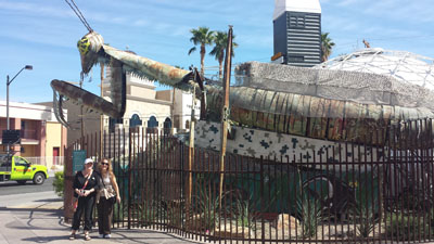 Gigantic praying mantis at entrance to Container Park. Annie and Jen next to it for comparison.