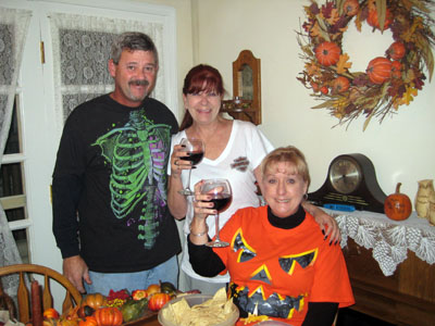 | Our hostess, Karen, with Dave and Jaynie pre-pumpkin carving!! That's why they look so happy. |