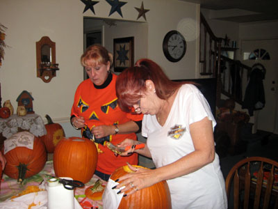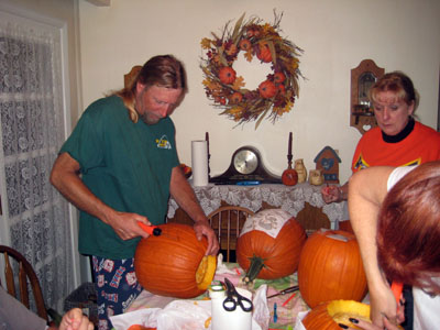 | Karen has her pattern taped to her pumpkin; Sharon has just cut off the top and is getting ready to gut her pumpkin; and Bob is in the middle of gutting his. |